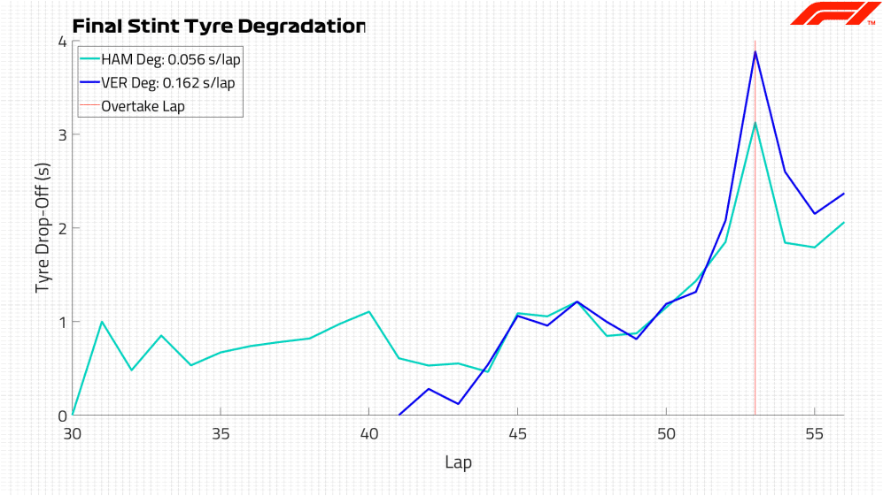 Fundamentalmente, en la vuelta 53, la vuelta en la que Verstappen pasó a Hamilton , ambos pilotos estuvieron aproximadamente iguales en la degradación general de los neumáticos. Después de devolver la posición por superar los límites de la pista, Verstappen ahora estaba en desventaja, habiendo utilizado más el rendimiento de su neumático que Hamilton en esta etapa.