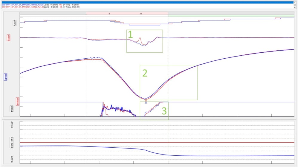 3. La corrección significa que Hamilton tiene que ser más cauteloso al acelerar, mientras que Verstappen es capaz de aplicar el acelerador antes y obtener una mejor aceleración en la curva.