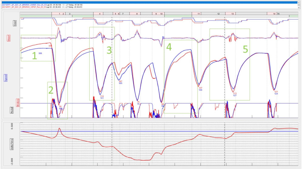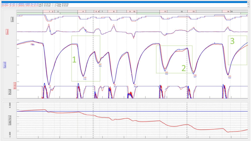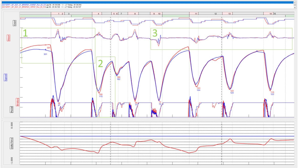 Aquí comparamos la vuelta 43, donde Verstappen persigue a Hamilton con sus neumáticos más nuevos. Una vez más, el gráfico muestra, de arriba a abajo, la marcha, la entrada de la dirección, la velocidad, el acelerador / freno y el tiempo delta, pero esta vez Verstappen es el trazo rojo y Hamilton el azul.