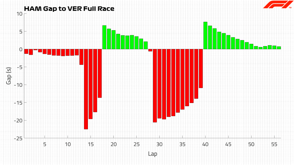 Como resultado de no poder cubrir el socavado, Red Bull tuvo que extender sus períodos (ver arriba) con la esperanza de atrapar a Hamilton durante la fase final de la carrera usando neumáticos más frescos.