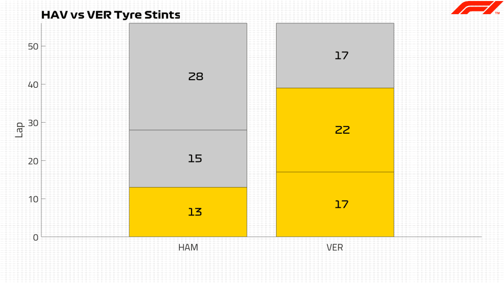 Con Hamilton haciendo su segunda parada 11 vueltas antes que Verstappen, la gestión de los neumáticos fue clave para mantener el liderazgo. Su última etapa con el neumático duro fue de 28 vueltas, y Lance Stroll fue el único otro piloto en el Top 10 en completar tantas vueltas.