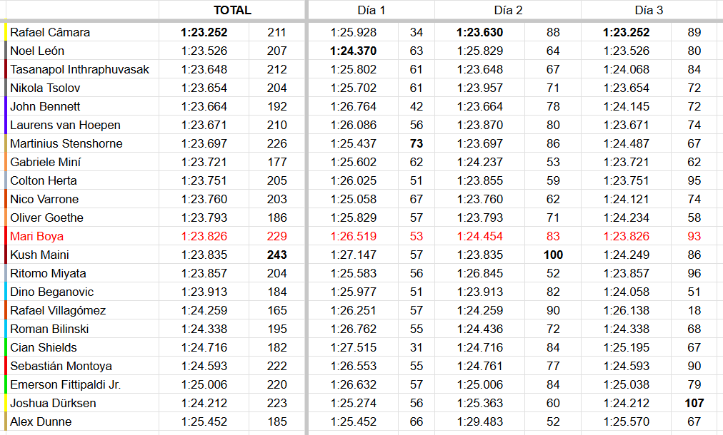 El top 5 matinal lo han completado Tsolov, Laurens van Hoepen y Gabriele Minì, mientras que Colton Herta, Mari Boya, Ritomo Miyata, Dino Beganovic y Inthraphuvasak han cerrado el top 10.