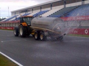 Un tractor remolque con un tanque de agua roció la pista para que sea lo más húmeda posible.
