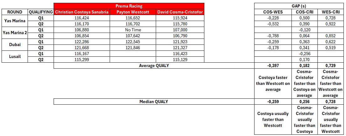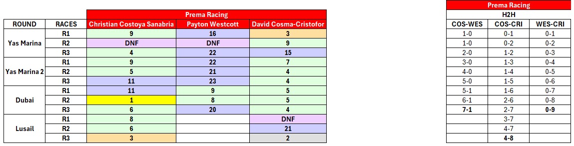 En cuanto a las carreras, Costoya ha sido el único piloto capaz de lograr una victoria para Prema, igualando además a Cosma en número de podios. Ambos han puntuado en 9 de las 12 carreras disputadas, lo que supone un 75%. Westcott, por su parte, solo sumó puntos en 2 de las 9 pruebas en las que participó (22,22%).