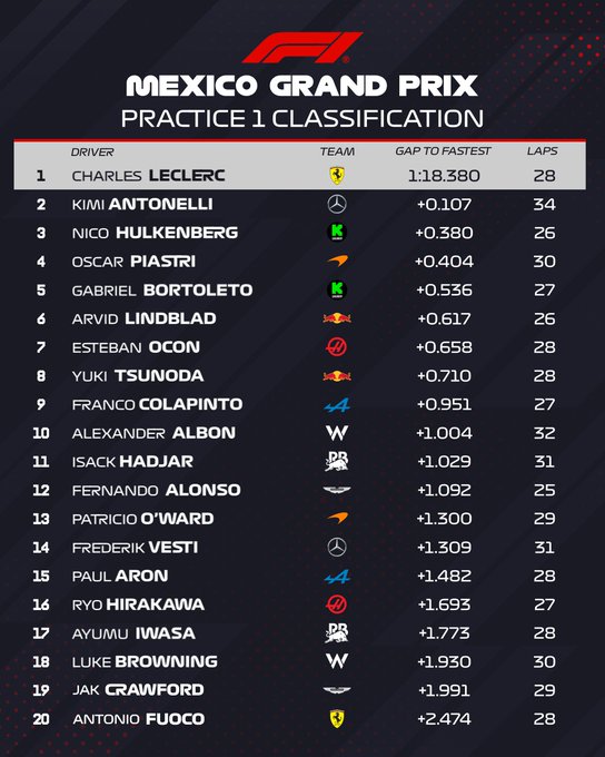 Entrenamientos libres 1 Gran Premio de Fórmula 1 México circuito Hermanos Rodríguez / Resultados Oct 24, 2025 mamenf1